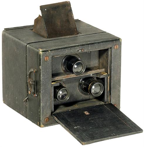 "Cosmopolite Stéréo" (9 x 18), um 1892 E. Français, Paris, France. Stereokamera in Boxform mit Spiegelreflexsucher, innere Entfernungseinstellung über Spindel, Doppelrotationsverschluß, einstellbar durch Federspannung. 3 identische Objektive. Aufnahmeobjektive für Steckblenden, mit zusätzlicher Makroeinstellung und Bajonettfassung. Kassette mit 2 unbenutzten Glasplatten. - Äußerst selten!