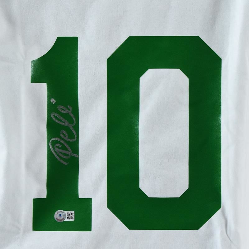 This is a replica Cosmos soccer Jersey autographed by legendary Brazilian footballer, Pele. This piece is presented with a Certificate of Authenticity from Beckett with a QR code and certification number. Measures approx. 30" x 28" (jersey).