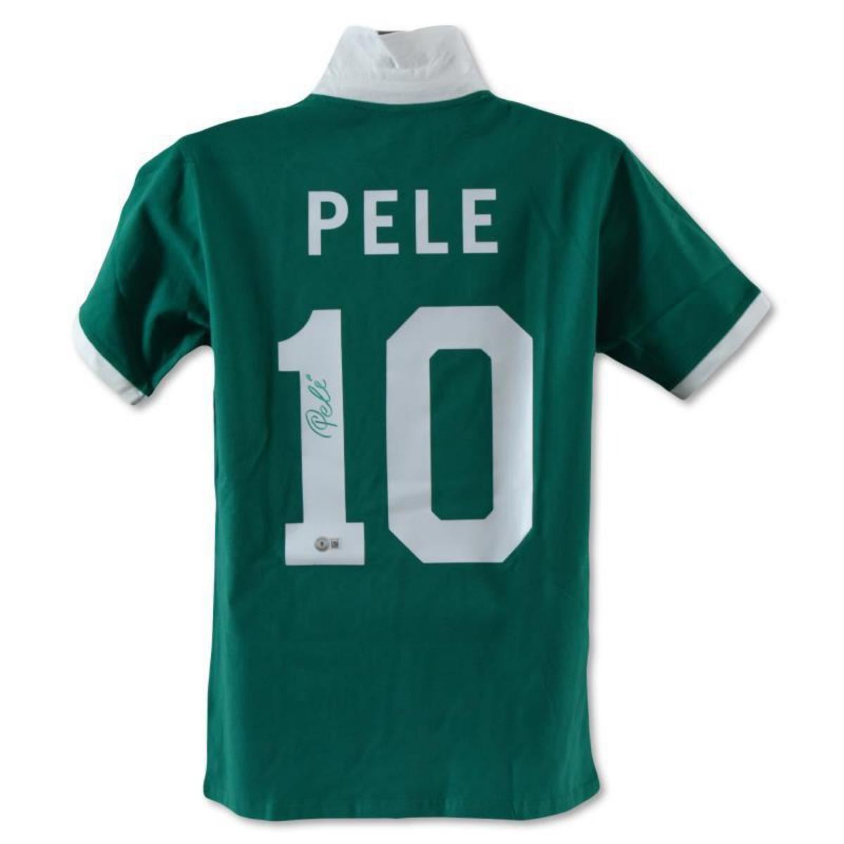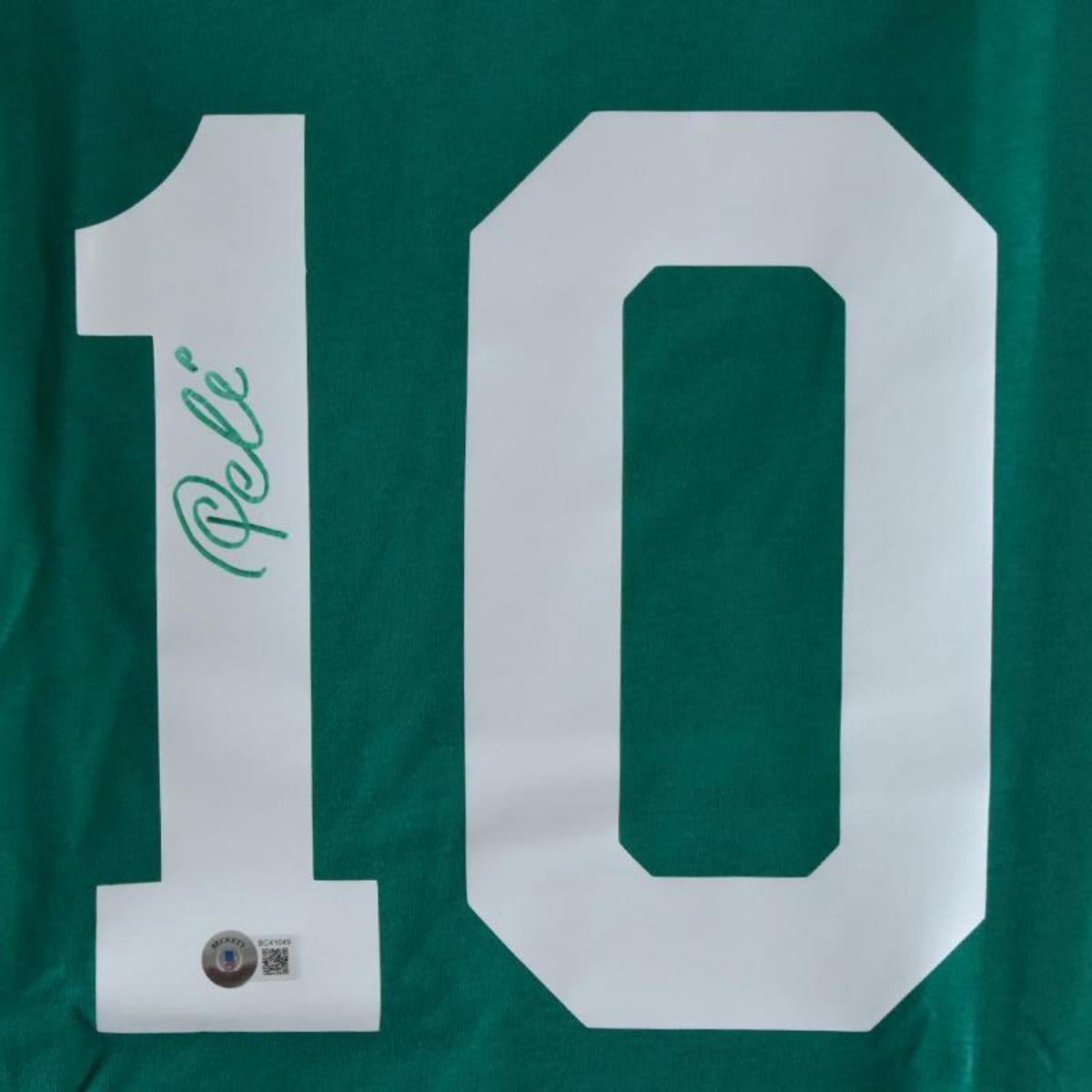 This is a replica Cosmos soccer jersey (Green) autographed by legendary Brazilian footballer, Pele. This piece is presented with a Certificate of Authenticity from Beckett with a QR code and certification number. Measures approx. 30" x 28" (jersey). Reference #: 254077