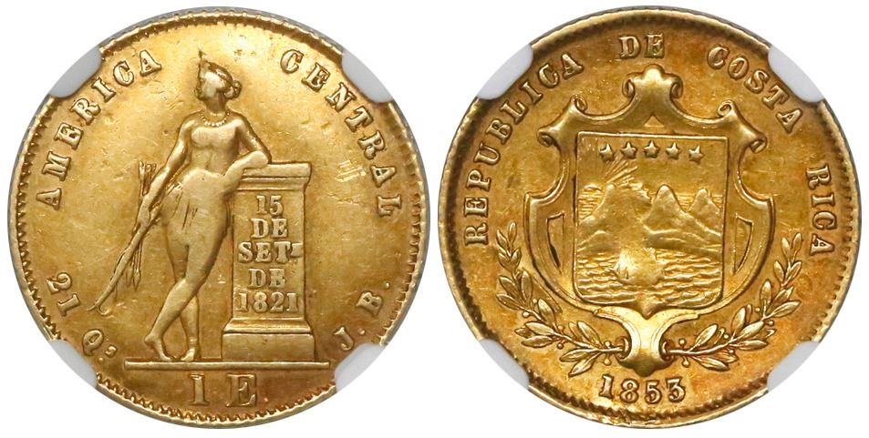 Costa Rica, 1 escudo, 1853JB, encapsulated NGC XF 45, ex-Richard Stuart (stated inside slab). KM-98. Lightly red-toned, more like AU in our opinion yet with typically weak high points on standing Liberty. Pedigreed to the Richard Stuart collection.