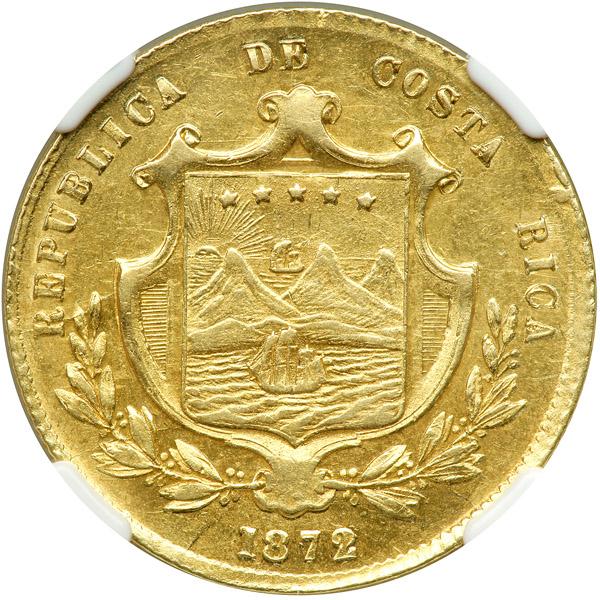 Costa Rica. 10 Pesos, 1872-GW. Fr-11; KM-115. Weight 0.4129 ounce. Mintage 4,555. Arms above sprays. Reverse: Value spelled out. Scarce date. NGC graded EF-45.