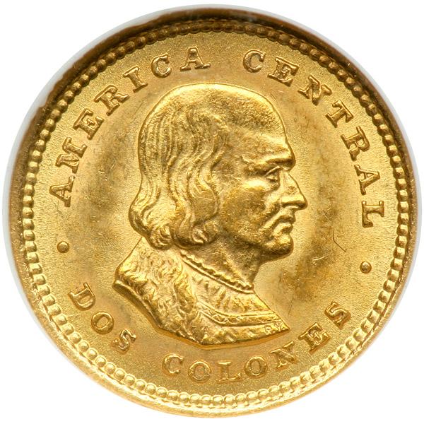 Costa Rica. 2 Colones, 1900. Fr-22; KM-139. Weight 0.0450. National arms. Reverse: Bust of Columbus right. NGC graded MS-64.