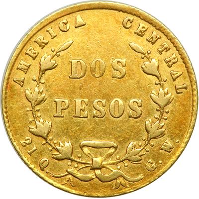 Costa Rica. 2 Pesos, 1866-GW. Fr-14; KM-113. Arms. Reverse: Value in wreath. Lightly cleaned and toned. About Very Fine.