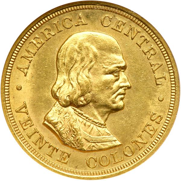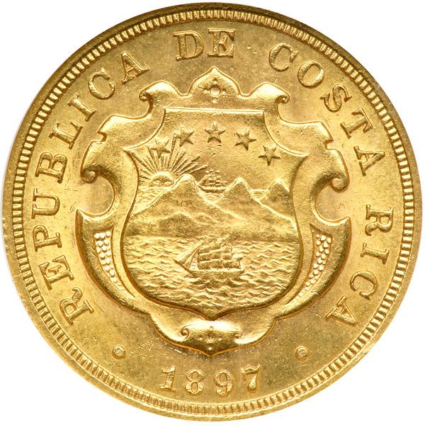 Costa Rica. 20 Colones, 1897. Fr-19; KM-141. Weight 0.4502 ounce. National arms. Reverse: Bust of Columbus right. NGC graded MS-63.