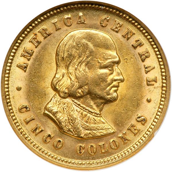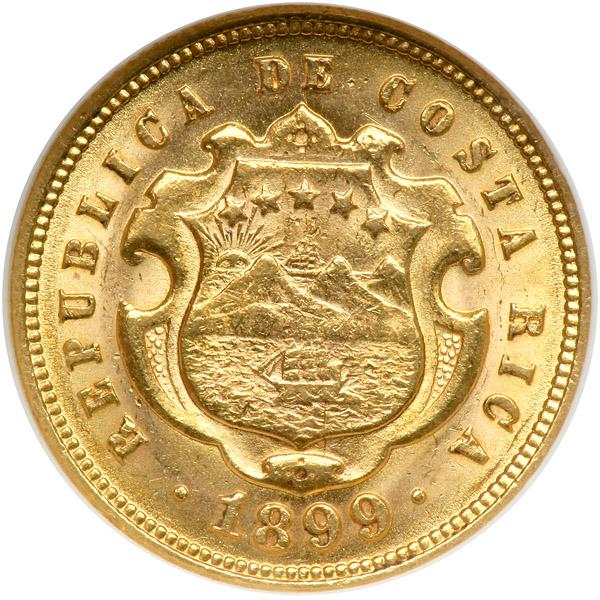 Costa Rica. 5 Colones, 1899. Fr-21; KM-142. Weight 0.1126 ounce. National arms. Reverse: Bust of Columbus right. NGC graded MS-62.