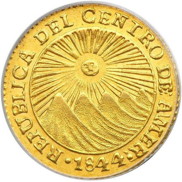 Costa Rica. Escudo, 1844-CR M. Fr-4; KM-14 (Cen. A. Rep). Sun above five mountain peaks. Reverse: Tree divides value. Rare grade. PCGS graded MS-62.