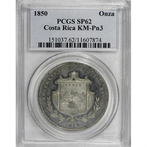 <B>Republic Pattern Onza 1850-JB,</B></I> KM-Pn3, Specimen 62 PCGS, white metal (tin) pattern for an unissued gold ounce. Prooflike surfaces with just a hint of light patination. Very rare type.<BR><BR><b>Shipping:</b> Coins & Currency (<a target="_blank" href="http://www.heritageauctions.com/common/shipping.php">view shipping information</a>)