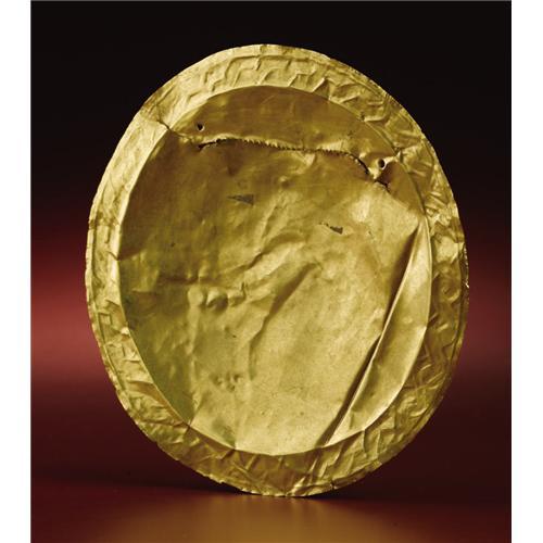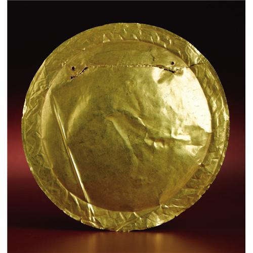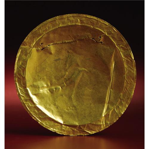 <B>Circular Breastplate</B></I><BR>Costa Rica or Panama<BR>A.D. 700 - 1500<BR>Gold, Weight 59.2 grams<BR>Diameter 6 ¾ in.<BR><BR>The relatively thin solid breastplate is bordered by a carefully chased pattern of two continuous, interwoven bands. Two small suspension holes were punched far apart just inside this band. A four-inch long tear crosses below these holes, and one fold crease is clearly visible at the viewer's lower left. There are several minor tears at the edges.<BR><BR>The lot is sold with a statement of authenticity from the distinguished expert Robert Sonin.<BR><BR>Provenance<BR>Charles Craig, Santa Barbara<BR><BR>