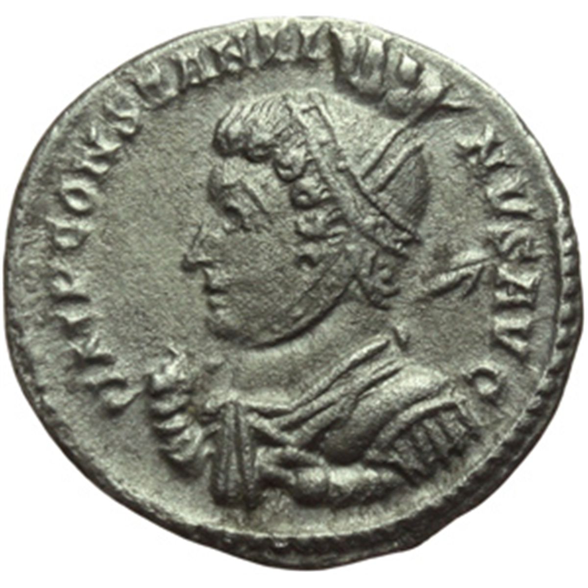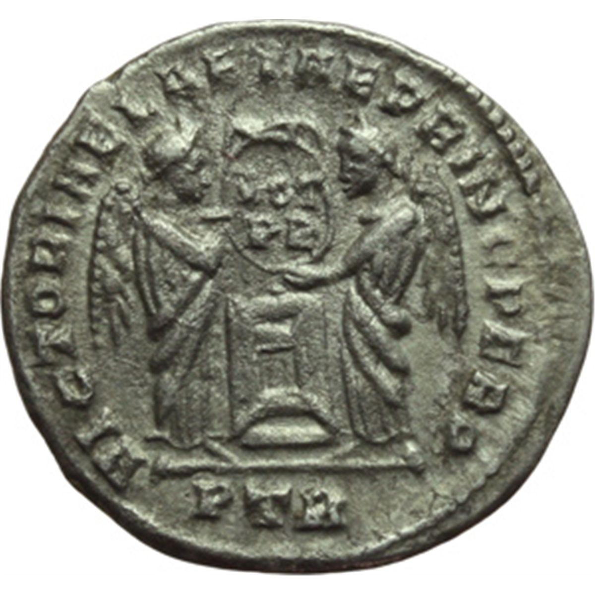 Impero Romano. Costantino I (307-337). Billon-argenteo, Treveri. D/ IMP CONSTANTINVS AVG. Busto elmato e corazzato a sinistra tiene la lancia sulla spalla destra. R/ VICTORIAE LAETAE PRINC. PERP. Due Vittorie tengono scudo con iscrizione VOT/P.R. su altare. In esergo: PTR. RIC 208 A (R3). MI. g. 2.21 mm. 17.00 RR. Molto raro e di qualitv† eccellente per il tipo. qSPL.