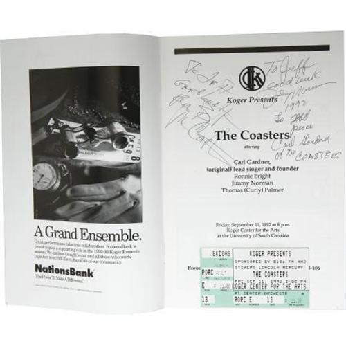 <B>Coasters Autographed Program and Ticket Stub (1992).</B></I> September 11, 1992, at the USC Koger Center for the Arts. Program is autographed by Carl Gardner and Jimmy Norman. Program and stub are in NM- condition.<BR><BR><b>Shipping:</b> Books & Catalogs (<a target="_blank" href="http://www.heritageauctions.com/common/shipping.php">view shipping information</a>)