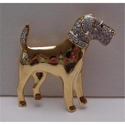 Butler and Wilson Stately Terrier in gold tone with a rhinestone head. It is a lovely piece in excellent condition with no cracks or chips and no stones missing. The light bounces off the picture, so any apparent defects are in the picture and not the brooch