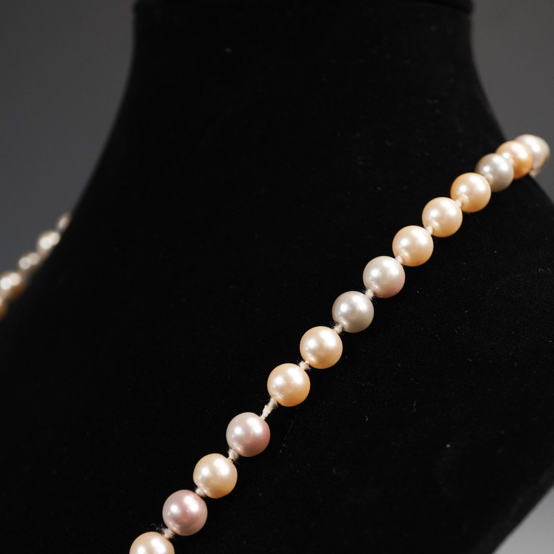 Costume faux pearl necklace featuring cream-tone beads and an ornate decorative clasp accented with green and clear rhinestones. Measures approximately 35.5"L from clasp to clasp. A charming vintage-style piece, ideal for adding classic elegance to any jewelry collection.