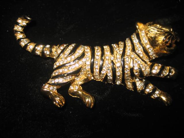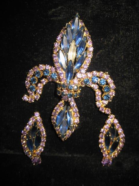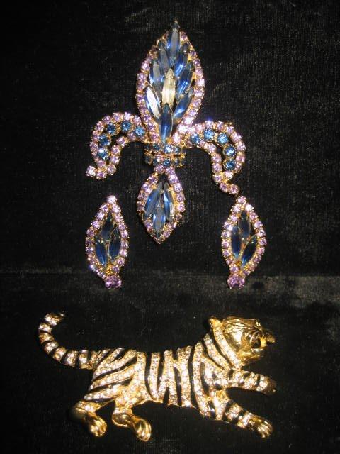 Consisting of: 2 pcs. 1-jeweled Tiger pin by Hattie Carnegie, 1-blue jeweled fleur-de-lis pin & matching pair of earrings by Hobe.