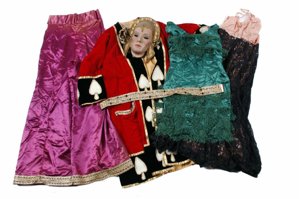 Costume Lot including a Mardi Gras type mask, a velvet coat with card suits on lapels, and others. F