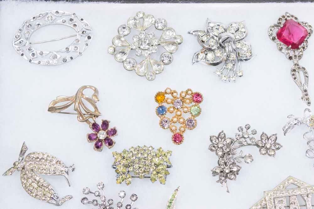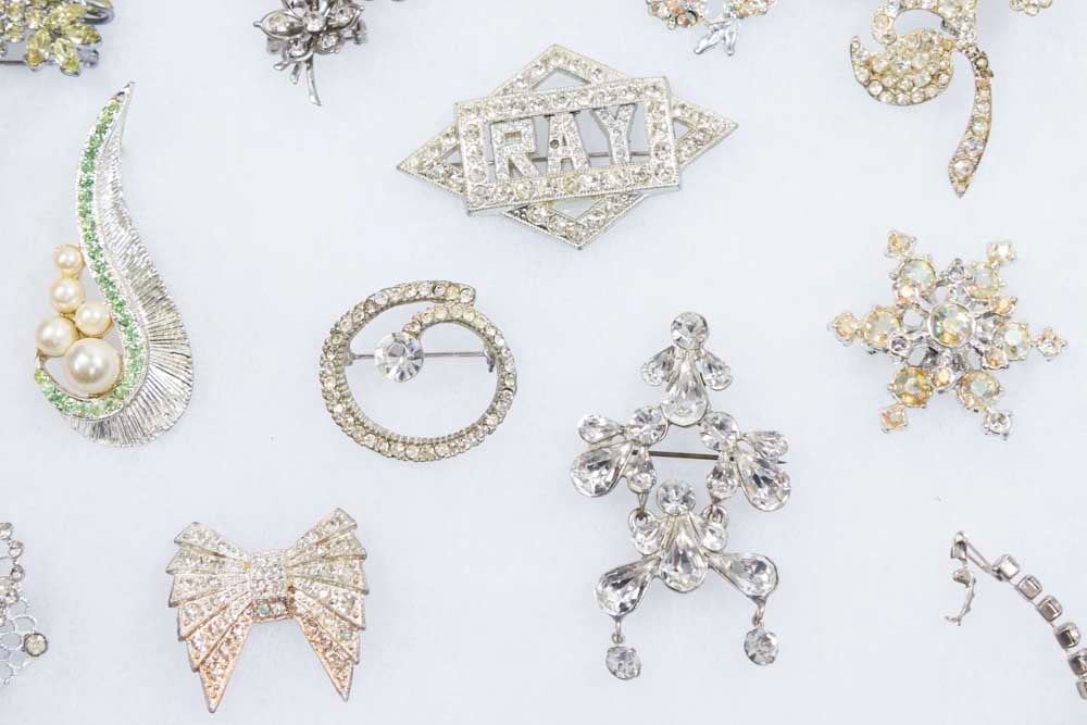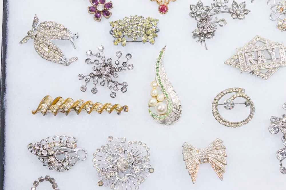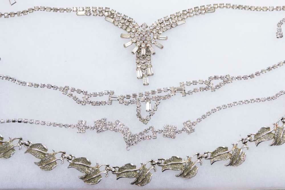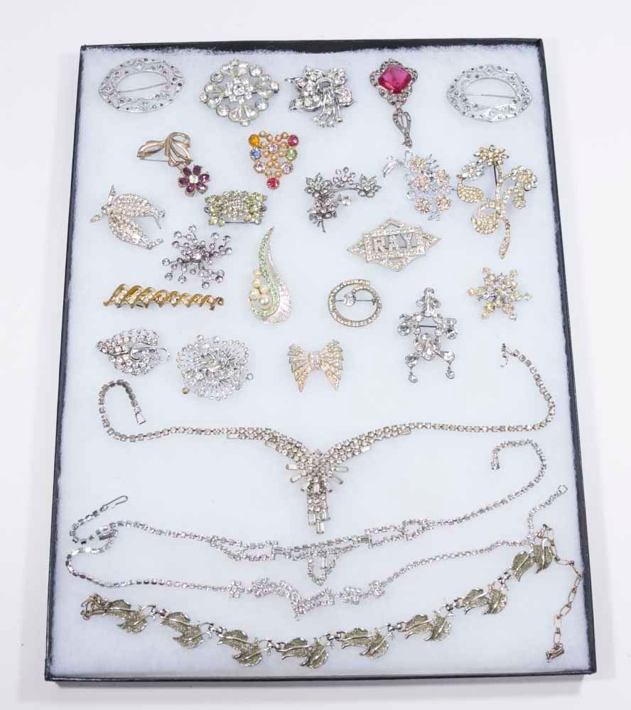 Rhinestone brooches and necklaces.