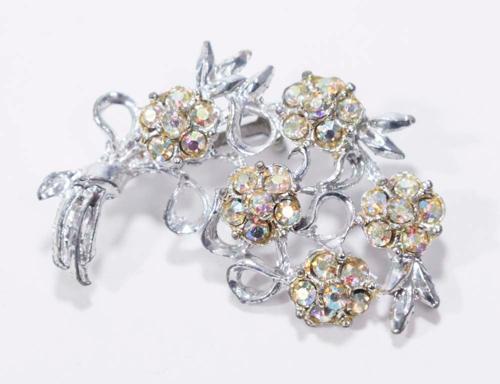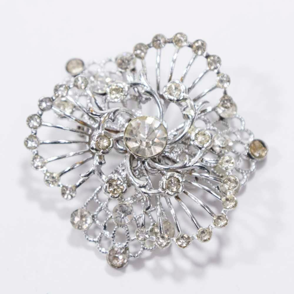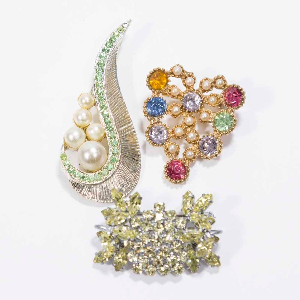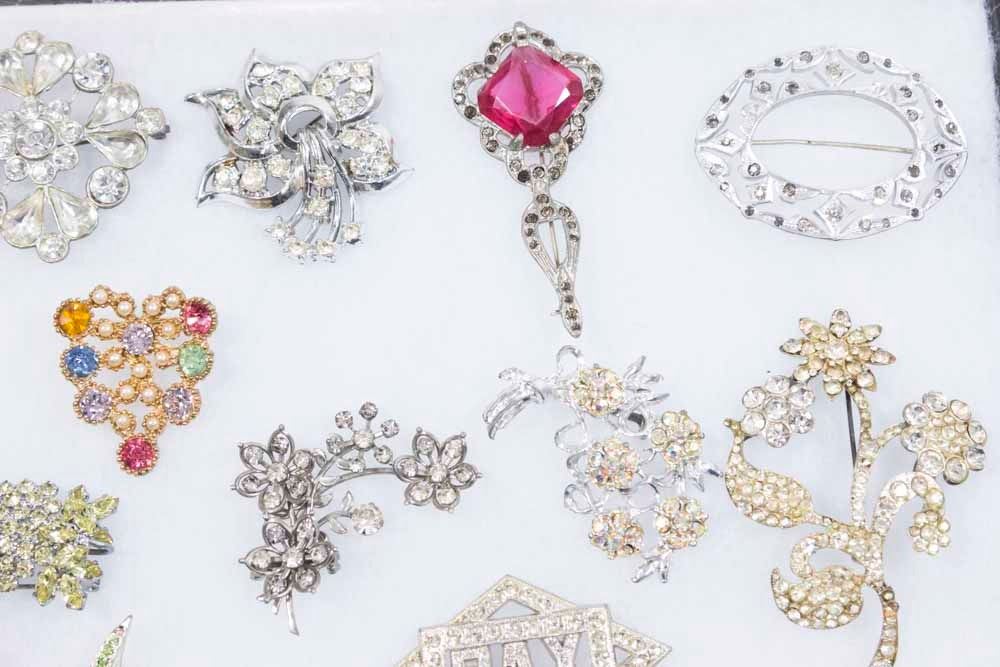 Rhinestone brooches and necklaces.