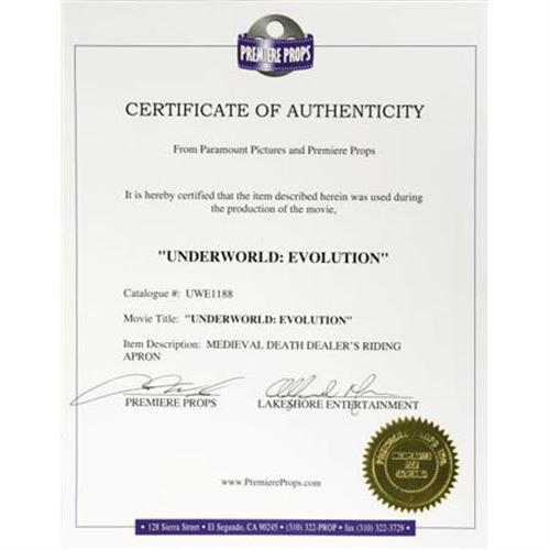 <B>Costume from "Underworld: Evolution."</B></I> A faux leather riding apron worn by "Death Dealer #1," as is labeled along the interior, in <I>Underworld: Evolution.</B></I> With drawstrings tipped with flint and black quartz arrowheads, the riding apron is in Very Fine condition with slight fraying to edges. Perfect for fending off Lycans. <I>Accompanied by COA from Premiere Props</B></I>. <I> Accompanied by COA from Hollywood Prop Supply.</B></I><BR><BR><b>Shipping:</b> Clothing, Costumes & Jerseys (<a target="_blank" href="http://www.heritageauctions.com/common/shipping.php">view shipping information</a>)