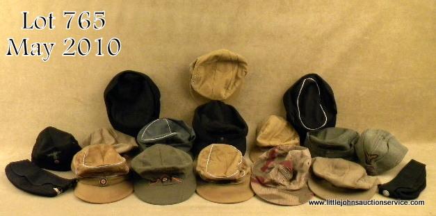 Costume or reenactment lot of caps from various branches of German service including SS, tropical, mountain troops, army, and others. Not able to authenticate originality. Sold as reenactment and display pieces only. All well made and appeargenuine until closely examined. 17 pieces. Some parts or pieces may be authentic. Est: $350 - $700