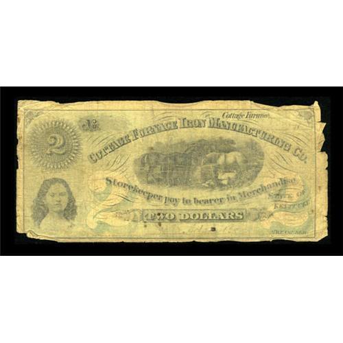 <B>Cottage Furnace, KY- Cottage Furnace Iron Manufacturing Co</B></I>. $2 18__ Hughes UNL<BR> The same vignette is on all the dollar denominated notes of this issuer. <B>Good-Very Good.</B></I><BR><BR><b>Shipping:</b> Coins & Currency (<a target="_blank" href="http://www.heritageauctions.com/common/shipping.php">view shipping information</a>)