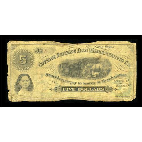 <B>Cottage Furnace, KY- Cottage Furnace Iron Manufacturing Co</B></I>. $5 18__ Hughes UNL<BR> We have several notes from this issuer in this auction, but they are still very scarce items. <B>Good-Very Good.</B></I><BR><BR><b>Shipping:</b> Coins & Currency (<a target="_blank" href="http://www.heritageauctions.com/common/shipping.php">view shipping information</a>)
