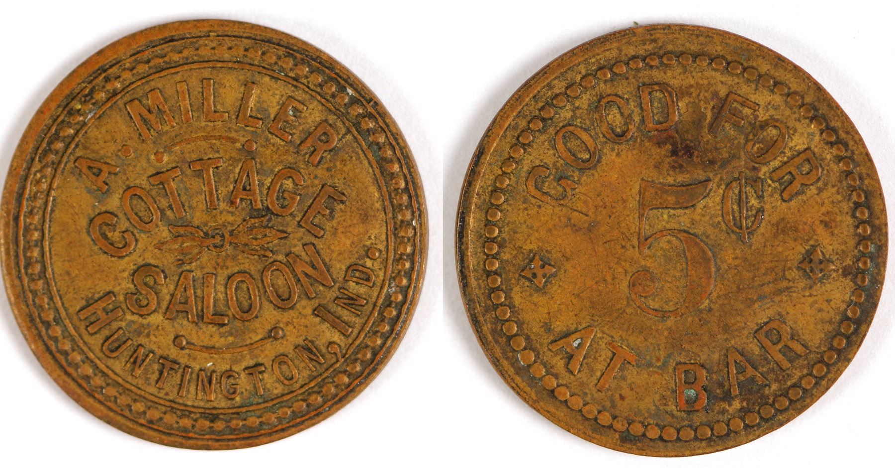 Obv.: A. Miller / Cottage / Saloon / Huntington, Ind.; Rev.: Good For / 5c / At Bar. Br., rd., 25 mm. Daniel Manasselian Collection. State: Indiana City: Huntington Date: ID# 78216