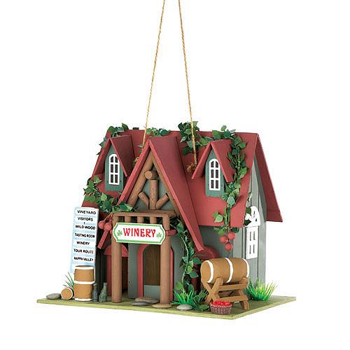 Cottage Winery Birdhouse **|**|** Birds wont be able to resist an overnight stop-over at this quaint cottage winery! The green cottage features a darling brick-red roof that's crawling with ivy. Faux wine barrels perch outside, welcoming your feathered friends to the perfect place to unwind. Clean out hole on back. Item Weight: 1.4 lbs. 10-1/4 x 7" x 8" high. MDF wood. 1 EA"