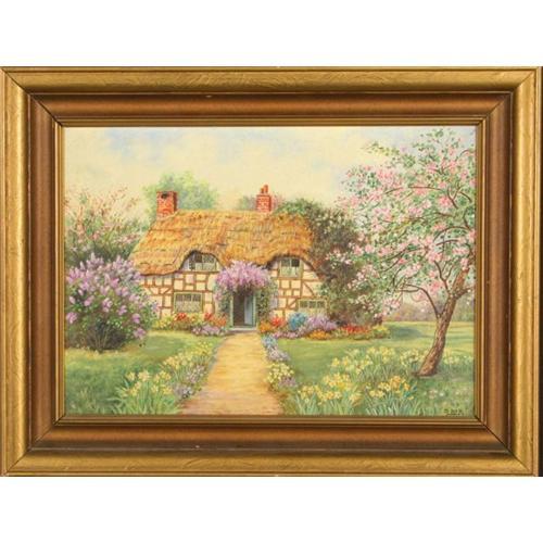 The artist expertly captures a beautiful spring day through the vivid use of bright colors that bring to life the purples of the lilac tree and the cherry blossoms that seem to spring off the canvas. The cottage in this painting gives an old country feel to those who admire it. This very desirable piece is complimented by a golden wide frame that brings out the splendid golden sunlight in this picture. The entire piece measures a total of 13.5?x17.75?. The colors of this painting bring together a piece that pleasantly captures your attention. Signed in the bottom right corner, this painting would be a great addition to any art enthusiast?s collection and is nicely priced.