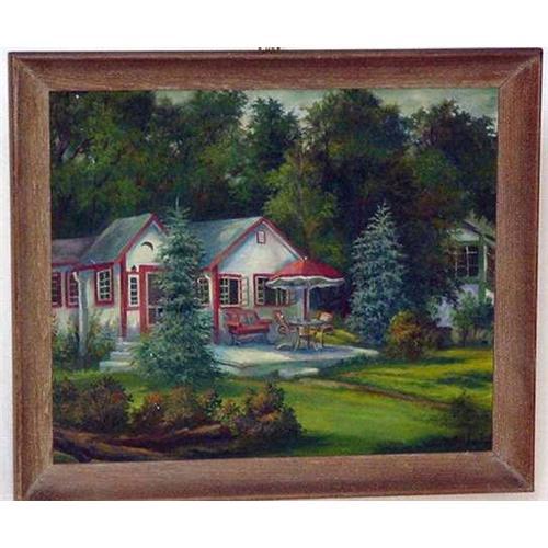 An amateur oil painting on canvas, 23 1/4" X 27 1/4" framed. A scene of cottages in the summertime forest, decorative and cute. Signed lower right S. Tattlebaum.