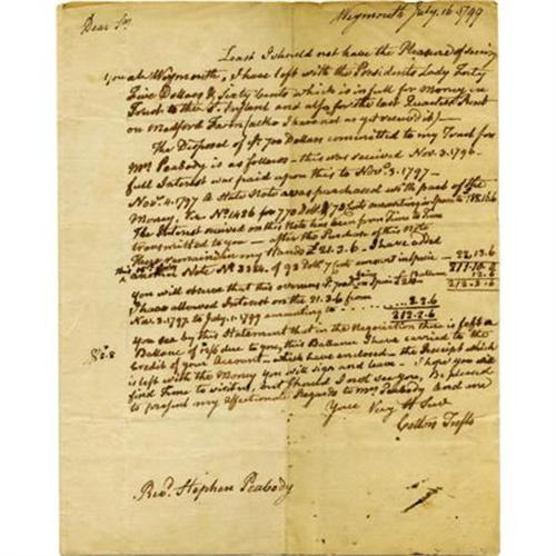 <B>Cotton Tufts Autograph Letter Signed</B></I> “<I>Cotton Tufts,</B></I>” one page, 7.25” x 9”. Weymouth, July 16, 1799. To Revd. Stephen Peabody. Damaged integral leaf addressed “<I><BR> evd. Stephen Peabody</B></I>” by Tufts. The letter, in part, “<I>Least I should not have the Pleasure of seeing you at Weymouth, I have left with the President's Lady Forty Five Dollars & Sixty Cents which is in full for Money in Trust to the 1st Instant and also for the last Quarter Rent on Medford Farm (although I have not as yet receiv'd it)…</B></I>” Tufts then tells Rev. Peabody, in detail, how he has disposed of “<I>700 Dollars committed to my Trust for Mrs. Peabody.</B></I>” He concludes, “<I>You see by this Statement that in the Negociation there is left a Balance of £12/6 due to you, this Balance I have carried to the credit of your Account - which have enclosed - the Receipt which is left with the Money you will sign and leave. I hope you will find time to visit us…</B></I>” Cotton Tufts (1734-1815), Weymouth, Massachusetts, physician and former member of the Revolutionary Committee of Correspondence, was Abigail Adams' uncle. He refers to her in this letter penned while John Adams was President and she was “<I>the President's Lady.</B></I>” Two years earlier, Rev. Stephen Peabody, a widower, had married the widow Elizabeth Smith Shaw, Abigail Adams' sister, so this letter has tremendous Adams family association. Light toning on right half of letter. Fine condition.<BR><BR><b>Shipping:</b> Flat Material, Small (<a target="_blank" href="http://www.heritageauctions.com/common/shipping.php">view shipping information</a>)