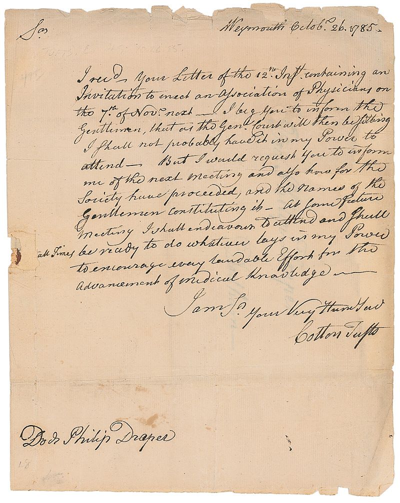 Pioneering American physician and patriot (1732–1815) who wrote the first article on animal diseases published in the United States and was a member of the family for whom Tufts University was named. ALS, one page, 7.5 x 9.25, October 26, 1785. Letter to Dr. Philip Draper. In full: “I read your letter of the 12th inst. containing an invitation to meet an Association of Physicians on the 7th of Nov. next–I beg you to inform the gentlemen, that as the Gen. Court will then be sitting I shall not probably have it in my power to attend–But I would request you to inform me of the next meeting and also how for the society have proceeded, and the names of the Gentlemen constituting it-At some future meeting I shall endeavour to attend and shall all Times be ready to do whatever lays in my Power to encourage every laudable Effort for the advancement of medical knowledge.” Intersecting folds, horizontal tear to upper portion, edge chips and tears, some light soiling, and paper loss to second integral page, otherwise very good condition.
