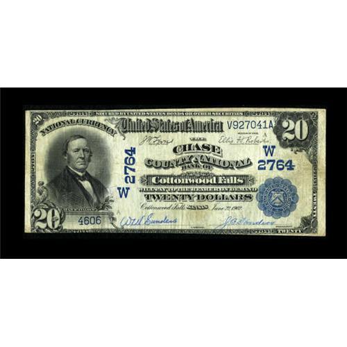 <B>Cottonwood Falls, KS</B></I> - $20 1902 Date Back Fr. 642 <B>The Chase County NB</B></I> Ch. # (W)2764<BR> Bright blue pen signatures of the Sanders family add much eye appeal to this lovely note. <B>Fine-Very Fine</B></I>.<BR><I>From The J.S. Weber Collection.</B></I><BR><BR><b>Shipping:</b> Coins & Currency (<a target="_blank" href="http://www.heritageauctions.com/common/shipping.php">view shipping information</a>)