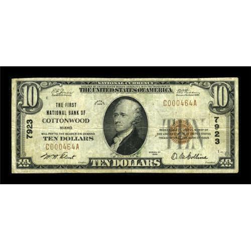 <B>Cottonwood, ID </B></I>- $10 1929 Ty. 1 <B>The First NB</B></I> Ch. # 7923<B></B></I><BR> A very scarce small size note from the only bank to issue here. This piece is new to the census and has never been offered previously to the collecting community. Nice <B>Fine-Very Fine.</B></I> <BR><I>From The Walla Walla Collection</B></I><BR><BR><b>Shipping:</b> Coins & Currency (<a target="_blank" href="http://www.heritageauctions.com/common/shipping.php">view shipping information</a>)