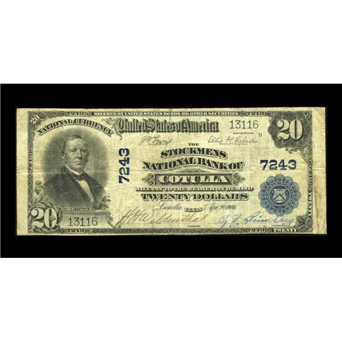 <B>Cotulla, TX</B></I> - $20 1902 Plain Back Fr. 650 <B>The Stockmens NB</B></I> Ch. # 7243<BR>A nice and evocative frontier occupational title graces this none too common large note. <B>Fine,</B></I> with two color pen signatures.<BR><BR><b>Shipping:</b> Coin/Currency (<a target="_blank" href="http://www.heritageauctions.com/common/shipping.php">view shipping information</a>)