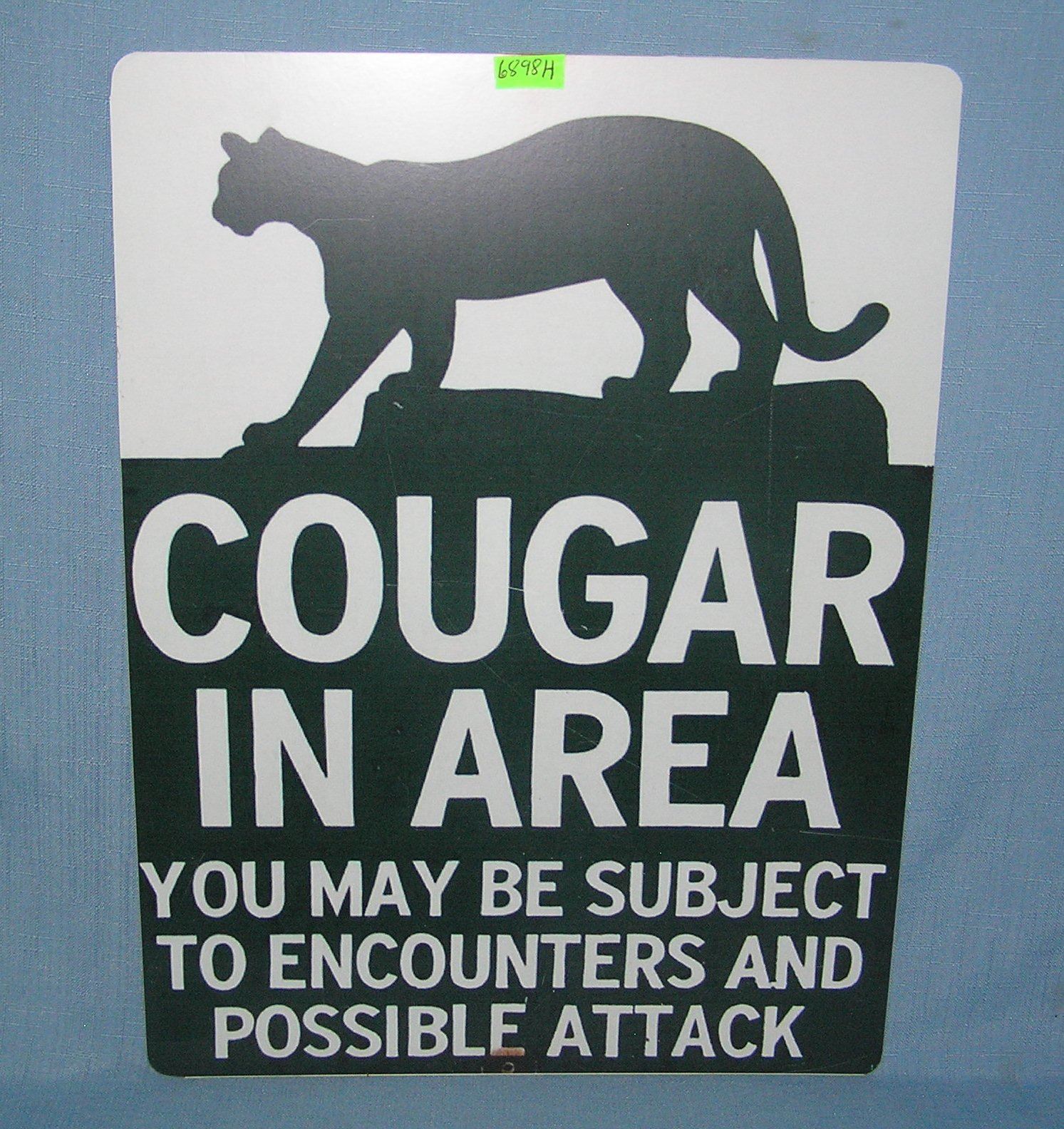 Cougar in Area you may be subject to encounters and attack retro style advertising sign printed on PVC hardboard these signs are auctioned for their decorative and display purposes 12 inches by 16 inches est. value $50.00-$60.00