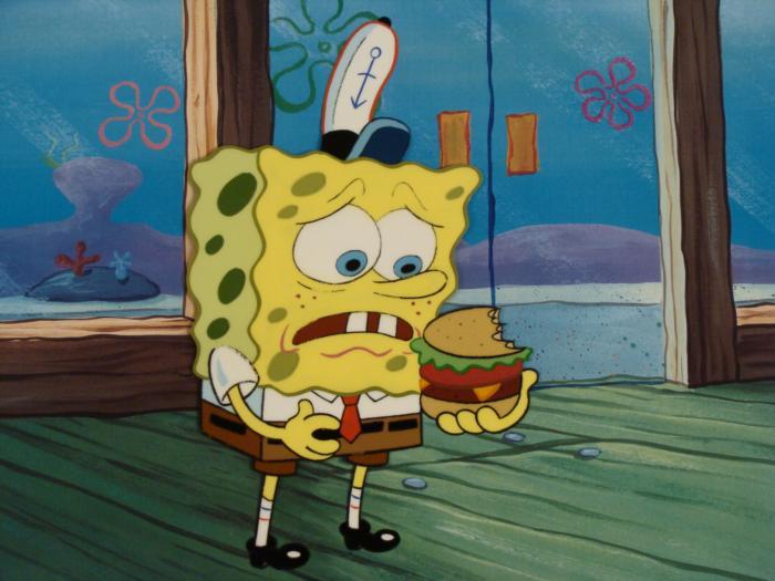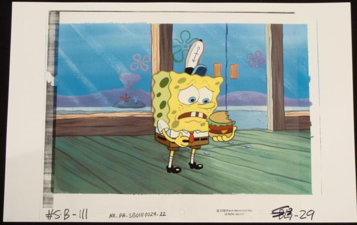 This animation cel and reproduction background are from the Nickelodeon TV show SpongeBob Squarepants. The story takes place under the deep blue sea in Bikini Bottom, where SpongeBob resides. SpongeBob, who is a yellow, porous sponge, is your typical happy-go-lucky character, as he is always cheerful and enjoys making people laugh. Patrick Star, SpongeBob's neighbor who is a starfish, is your average children's show idiot, as he boasts knowing nothing and is often getting himself into ridiculous situations. Between the homes of these two lies the home of the miserable Squidward, a squid, who is known for being grouchy and playing tricks on SpongeBob and Patrick. Both SpongeBob and Squidward work at the Krusty Krab, a fast food business run by the greedy money-loving Mr. Krabs, a crab, the arch rival of the evil, possibly misunderstood, Plankton. Another neighbor, Sandy Cheeks, an athletic squirrel who normally wears an astronaut's space suit, was introduced in "Tea at the Treedome." She spends most of her time inventing and experimenting. This couldn't be...Original Printed Background and Animated Cel Overall Size of Background: 11" x 17" Overall Size of the Cel: 10 1/2" x 12 1/2" Very good condition This is an original hand-painted cel set-up used in the production of an episode of "SpongeBob SquarePants." Each one-of-a-kind set-up represents a slight change in position of the characters. When individually photographed and projected in rapid succession, the images appear to move.