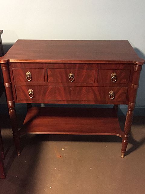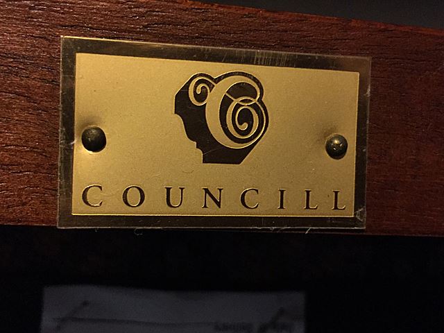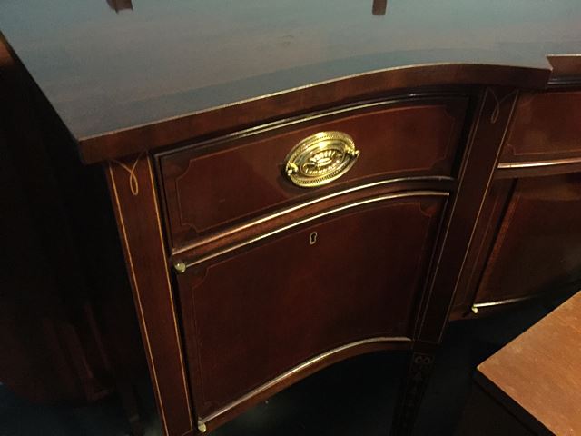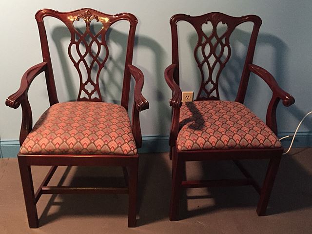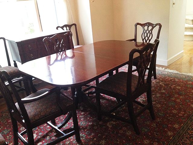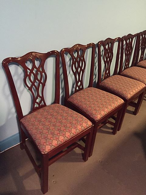 Stunning Councill Mahogany high style dining room set includes double pedestal table with 2 leaves, and pads, matching sideboard with bell flower inlay, matching server with 5 drawer pulls, and 8 matching Chippendale chairs, 2 are arm chairs and 6 are side chairs. This is an absolutely stunning dining room set! This matching set would retail around $10,000 to purchase new in today's marketplace! This set has to be picked up or our shippers can ship from Bristol, CT.