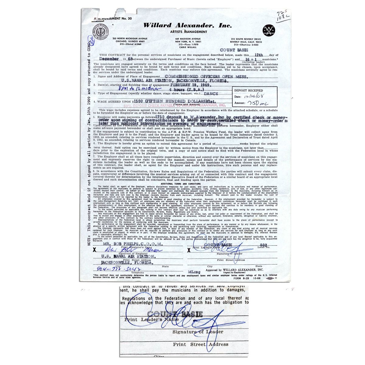 Jazz bandleader and composer Count Basie signs this contract, dated 12 December 1969, on behalf of his band to perform at the U.S. Naval Air Station in Jacksonville, Florida. Basie's phenomenal career, lasting nearly fifty years, began in the 1920's in Harlem. The bandleader signs the one page 8.5'' x 11'' Willard Alexander, Inc. Artists Management contract in blue ink: ''Count Basie''. Moderate chipping and staple attached to top edge, else very good condition.