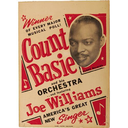 <B>Count Basie Orchestra with Joe Williams Concert Poster (circa 1955).</B></I> When Count Basie reformed his big band in the mid-1950s, he hired "Everyday I Sing The Blues" singer, Joe Williams. This line-up then recorded the seminal Jazz/Blues classic, "Count Basie Swings, Joe Williams Sings," which was released in 1956. Here's a great-looking vintage poster from that bygone era, featuring a cool newspaper-style "big dot" portrait of Basie, for a generic roadshow poster, printed in red and black on a cream cardstock. The poster measures 14" x 19.5", and is in Good condition, with numerous tackholes in all four corners, and a few small water stains.<BR><BR><b>Shipping:</b> Flat Material, Large (<a target="_blank" href="http://www.heritageauctions.com/common/shipping.php">view shipping information</a>)