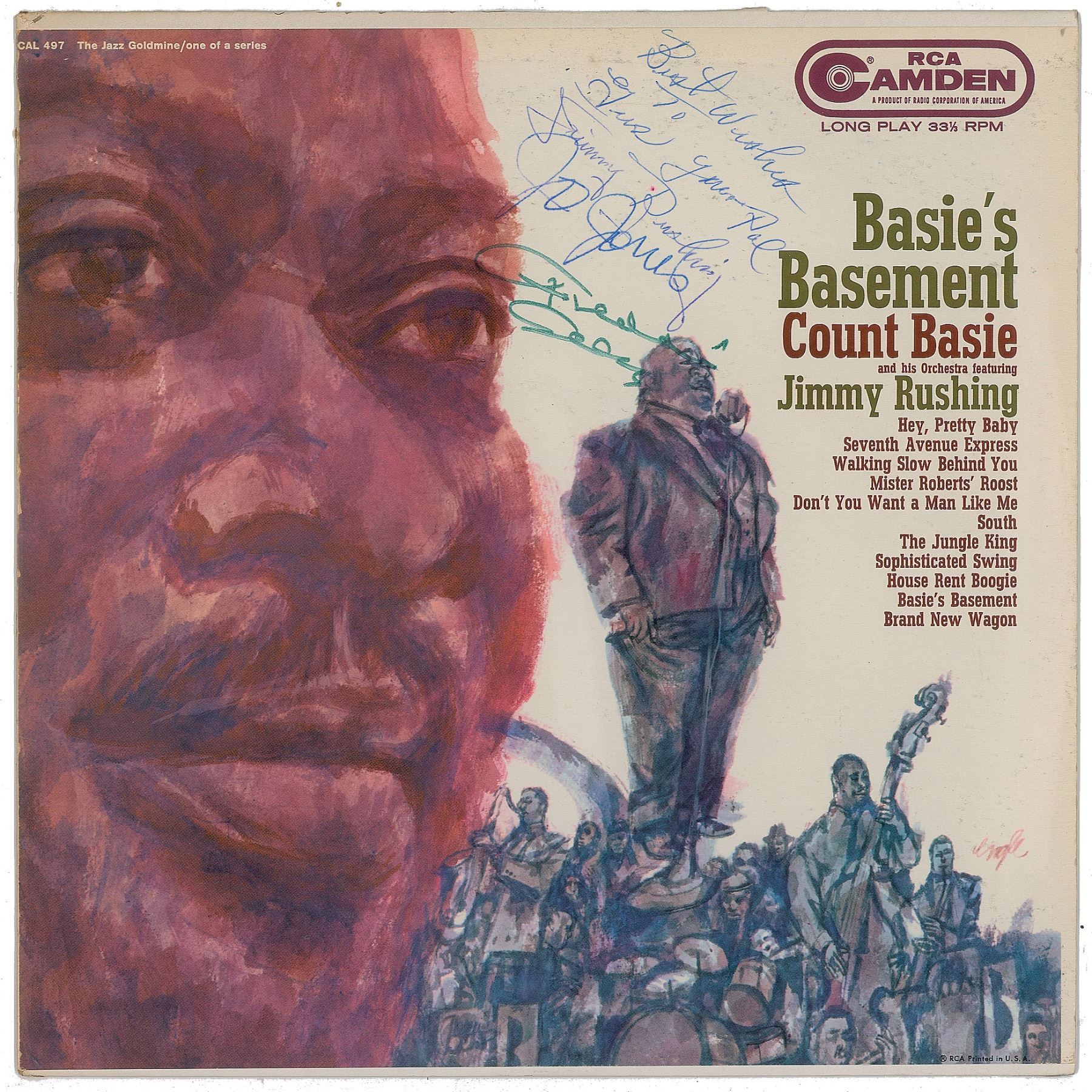 Basie's Basement album signed on the front cover in ink by Jimmy Rushing (ins), Jo Jones, and Freddie Greene, and on the back cover by Count Basie, Clark Terry, Emmett Berry (ins), and Buddy Tate (ins). In fine condition. The record is included.