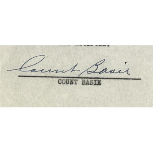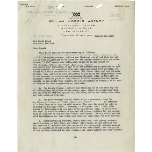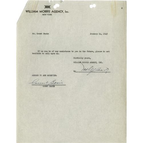<B>Count Basie Signed Contract.</B></I> William Morris Agency contract dated January 24, 1949, and signed by Basie in black ink. In Very Fine condition with light tanning and rusted paperclip marks. <I>With COA from PSA/DNA.</B></I>