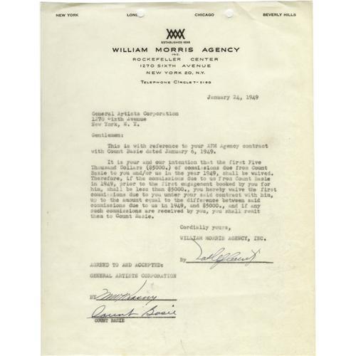 <B>Count Basie Signed Contract.</B></I> A single page agreement on William Morris Agency letterhead, dated January 24, 1949, signed by Basie in black ink. In Very Fine condition with mild wear and tanning, and the usual binder holes punched in the top edge.<BR><BR><b>Shipping:</b> Flat Material, Small (<a target="_blank" href="http://www.heritageauctions.com/common/shipping.php">view shipping information</a>) <BR><BR><B>Important notice:
