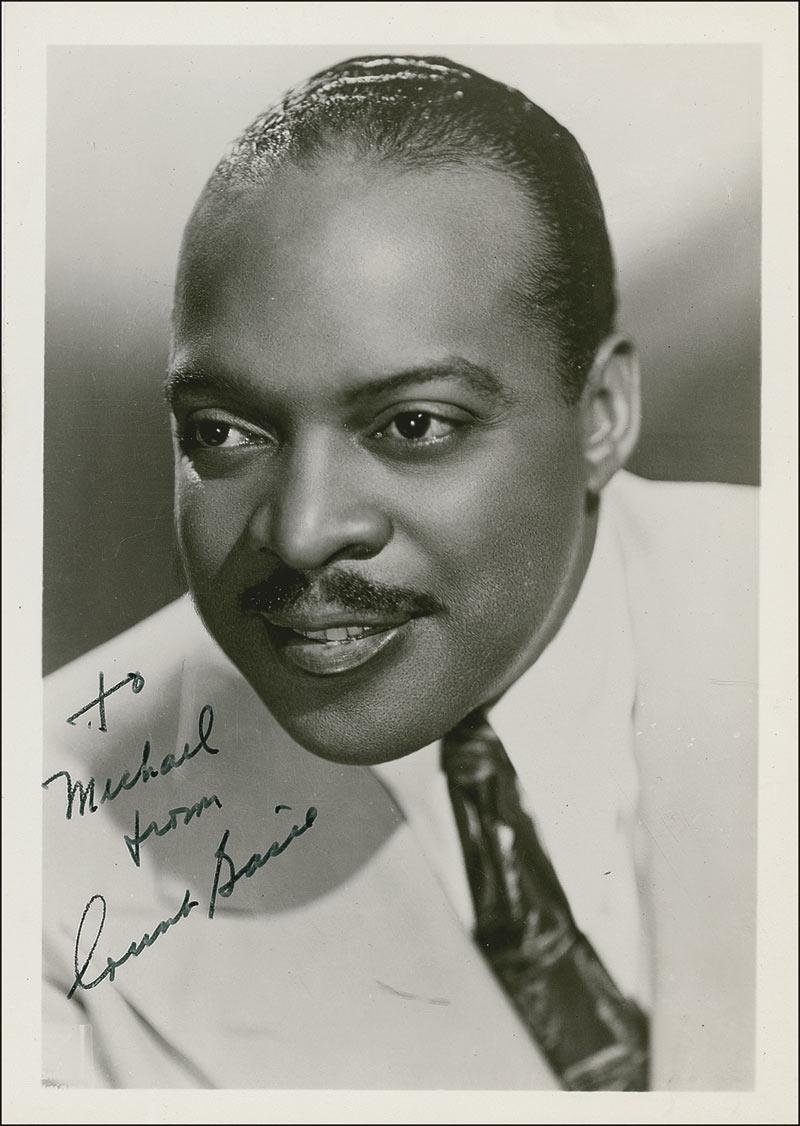 Glossy 5 x 7 head-and-shoulders photo, signed and inscribed in black felt tip “To Michael from Count Basie.” In fine condition, with a few scattered light surface dings. Accompanied by a certificate of authenticity from James Spence.