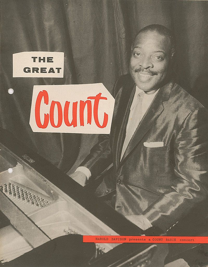 Original concert program from Basie’s 1957 UK tour, 8.25 x 10.5, 14 pages, with photos, articles, and song selections. Small pencil notation to one page and punch holes to left edge, otherwise fine condition.