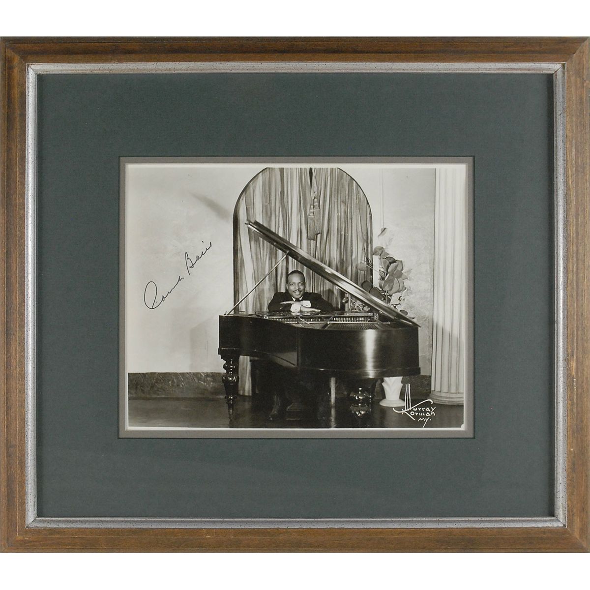 Glossy 9.5 x 7.5 photo of Basie sitting behind his piano, signed in black felt tip. Double-matted and framed to an overall size of 17 x 15. In fine condition.