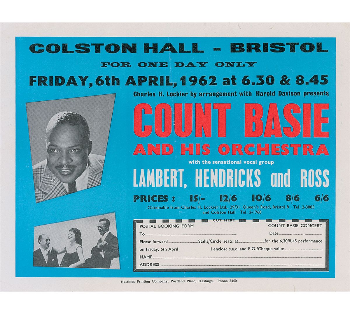 Scarce original color handbill for Count Basie and his Orchestra’s performance at Colston Hall on April 6, 1962. Handbill measures 9 x 7 and features a small image of Basie along the left side. In fine condition, with a central vertical fold.