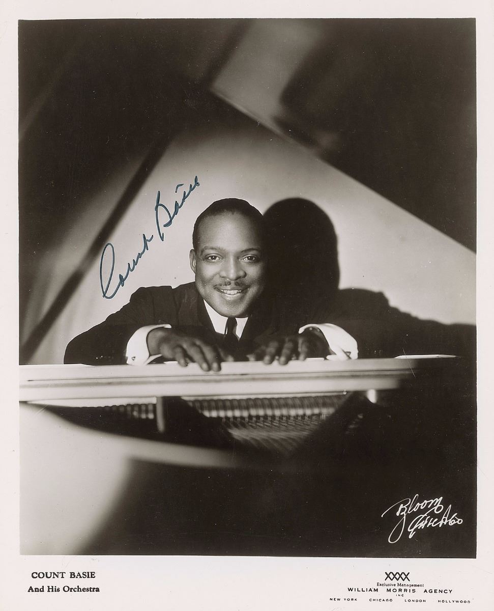 Appealing glossy 8 x 10 William Morris Agency publicity photo of Basie sitting behind his piano, signed in black felt tip. In fine condition.