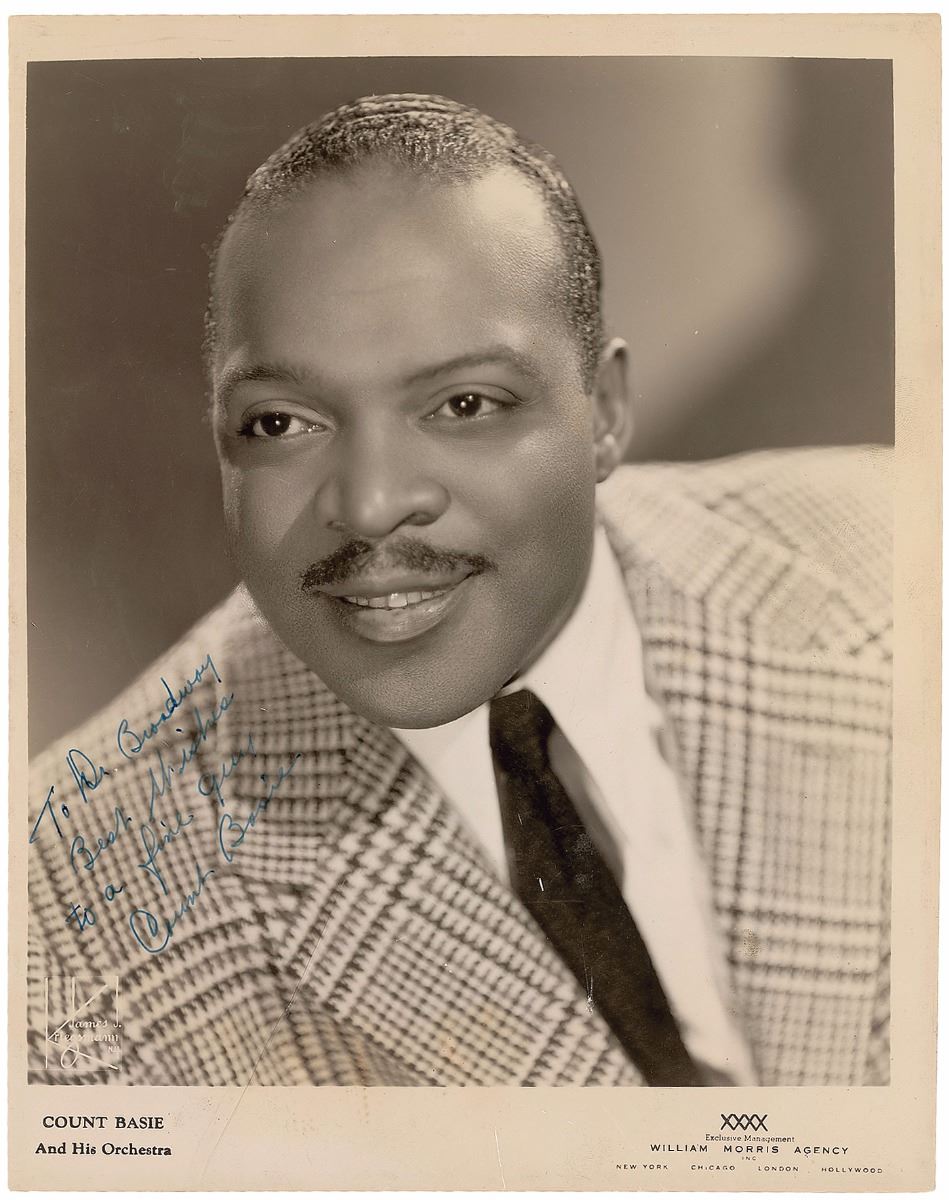 Vintage glossy 8 x 10 William Morris Agency publicity photo of Basie by James J. Kriegsmann of New York, signed and inscribed in blue fountain pen, “To Dr. Broadway, Best wishes to a fine guy, Count Basie.” Slight creasing and soiling, a tiny chip to surface, and a diagonal crease extending from the bottom edge to his lapel, otherwise fine condition.