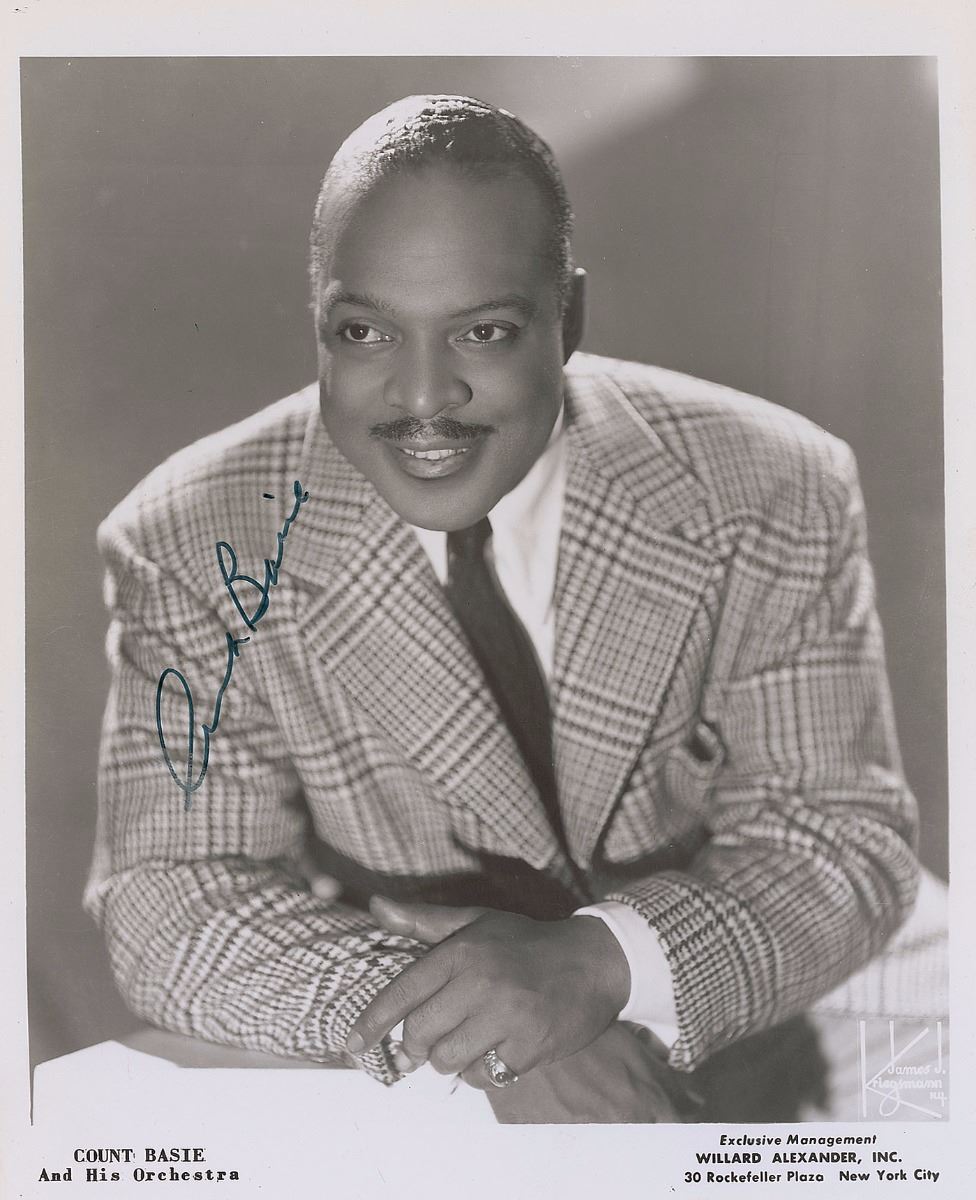 Handsome glossy 8 x 10 Willard Alexander publicity photo of Basie by James J. Kriegsmann of New York, signed in black felt tip. In fine condition, with trivial surface impressions.