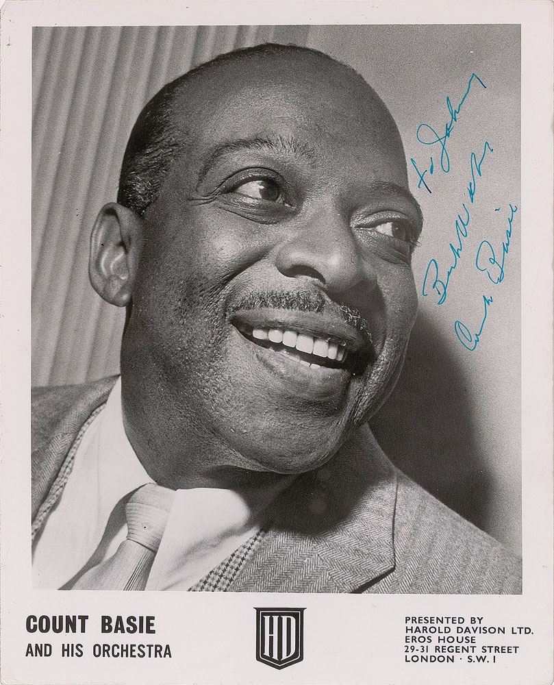 American jazz pianist, organist, bandleader, and composer (1904–1984) who led the Count Basie Orchestra for nearly 50 years, an ensemble that assisted in the careers of Lester Young, Freddie Green, Jimmy Rushing, and Joe Williams, among others. Vintage glossy 8 x 10 Harold Davison publicity photo of Basie in a cheerful close-up pose, signed and inscribed in blue fountain pen, "To Johnny, Best wishes, Count Basie.” In fine condition.
