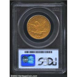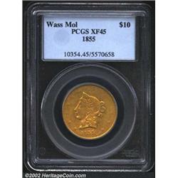 Count Samuel C. Wass and Agoston P. Molitor founded an assay office in San Francisco in October 1851. Both were Hungarian patriots who were expelled from their country by the Austrians. Both had acquired considerable mining and assaying skills from the School of Mines of Germany. They immigrated to California in October 1850 and 1851 respectively. After considerable research they opened an assaying office in October 1851. By the end of the year they were asked by the local merchants to mint coins for circulation since all other private coiners had ceased operations and the U.S. Assay Office was only issuing $50 gold pieces. When the latter was authorized to issue smaller denominations in 1852, Wass Molitor ceased their coining production, only to resume operations in 1855 when the newly established branch mint temporarily closed. At their peak, the firm was striking more than $38,000 a day in twenty and fifty-dollar gold pieces. They finally closed down their coinage operation for good by the end of 1855. These coins had the highest intrinsic value of any of the private gold coiners with an average value of $5.04 per $5 gold piece. They are also among the poorest struck of all private gold coins.1855 $10 Wass Molitor Ten Dollar XF45 PCGS. K-6, High R.5. This is the so-called "Plugged 5" type as it is believed that the 2 was drilled out of the original die and a 5 substituted before the new 1855 pieces were struck. These coins were struck from dished dies, with the result that the definition is uneven and the reverse is a good 20 points weaker than the obverse. The central reverse on the present coin is certainly more softly detailed than Liberty's portrait, but the obverse periphery is bluntly impressed with only some of the stars evident. Lovely copper-gold color confirms the originality of the expectantly abraded features. We last offered an XF45 PCGS representative of the 1855 Wass Molitor Ten Dollar as lot 7901 in our January 2002 FUN Signature Sale. That coin realized $13,225. Since the appearance of the S.S. Central America coins, the rarity of these pieces have been downgraded from R.7 to High R.5 as there are more than 40 pieces known today. Listed on page 297 of the current Guide Book.From The Estate of Jack L. Klausen. Important notice: We expect to be auctioning lots at the rate of 200-250 per hour. Sometimes eBay Premier live bid software cannot keep up with that pace, so we strongly recommend that you place a realistic proxy bid now as insurance to avoid disappointment. Also please note that all Heritage/CAA lots purchased through eBay Premier carry a 20% Buyer's Premium. Please make sure you read the Terms and Conditions.